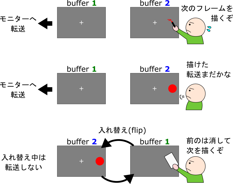 他にも刺激描画の確認用に補助線を引いたり、刺激画像のファイル名や現在の試行数、マウスカーソルの座標などの情報画を面に描画したり、参加者の反応待ちをスキップしたりするなど、動作確認用のコードを追加するといでしょう。