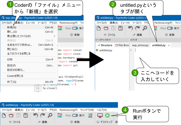 まず、Builderの実験の時と同様に、今から作る実験用にフォルダを作成することをお勧めします。CoderはBuilderと比べて自由度がとても高いので、「ひとつの実験 = ひとつのフォルダ」が守られていなくても問題ないように作成することも可能ですが、本書ではBuilderと揃えておきます。フォルダを作成したら、Coderを開いてメニューの「ファイル」から「新規」を選びましょう。すると untitled.py というタブが開いてまっさらなファイルが作成されます(図13.1)。ここへ文書作成アプリやメモ帳アプリのようにキーボードで文字を入力していくことができます。